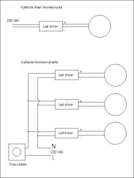 Toinen versio säädettävistä drivereista on triac-himmentimellä säätyvä malli. Säätimeksi sopii tavallinen hehkulampuille tarkoitettu verkkovirralla toimiva himmennin.