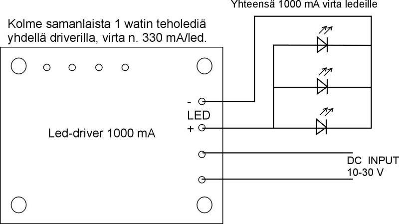 Drivereilla voidaan tehdä myös rinnankytkentä, esim. 1000 mA:n driver ohjaa 3 kpl 1 watin teholediä jopa alle 10 voltin jännitteellä. Himmennysohjeet ja muut kytkennät löytyvät lisäkuvissa, ks. kuvasarjat driverien yhteydessä. Kuvissa esitetyt ominaisuudet toimivat kaikissa mallisarjan drivereissa, 350, 500, 700, 1000 ja 1400 mA, vaikka useimmiten on kuvattu 350 mA:n versiota. 1400 mA:n drivereissä huomioitavaa sisäänmenojännitteen napaisuus. Drivereita voidaan kytkeä rinnakkain, jolloin saadaan drivereiden yhteenlaskettu vakiovirta, esim. 2 kpl 1400 mA:n driveria rinnakkain = 2800 mA ulos.
