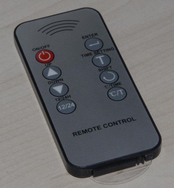 Punaiset led-numerot, näytössä vaihtuu vuorotellen lämpötilanäyttö (C) ja kellonaika (12/24 h näyttö valittavana). Näytön voi myös lukita pelkkään kellonaikaan tai lämpötilanäyttöön.