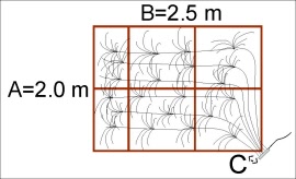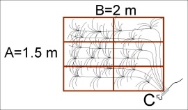 - Projektorin lisäksi valitse kohteeseen sopiva kuitunippupaketti. Paketissa on kuitujen pituudet optimoitu kuvan esittämään tilanteeseen, alueen mitat ja projektorin paikka ovat olennaisia tietoja. Optio C tarkoittaa projektorin sijaintia alueen reunasta. Jos asetelma poikkeaa huomattavasti kuvan tilanteesta, kuitujen lisäpituudella voidaan kompensoida muutakin eroavaisuutta.